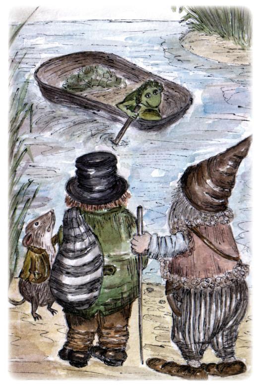 В посудине сидела жаба и, загребая длинным камышовым веслом мутные воды реки, раскатисто пела лягушачий романс. Заприметив наших путников, она направила своё судно к берегу.