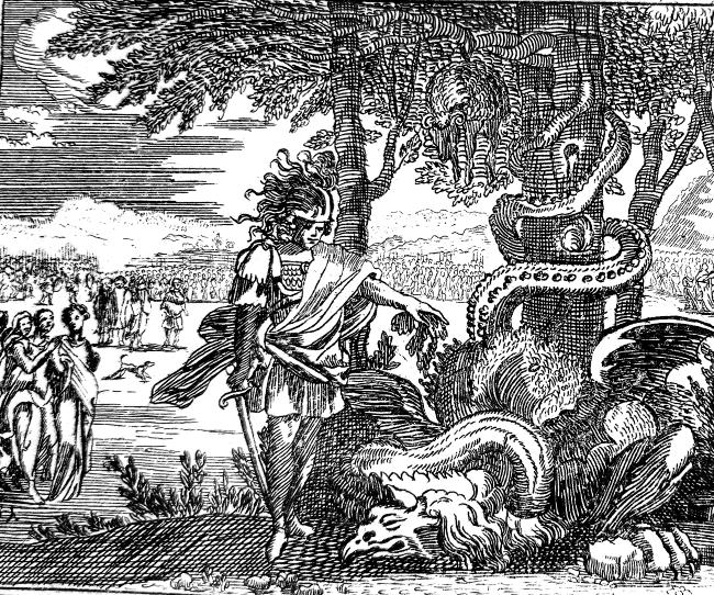 Еще одним драконоборцем неожиданно оказался предводитель аргонавтов Ясон. На миниатюрах Лицевого летописного свода Ивана Грозного (XVI в.) дракон с длинной верхней губой и торчащим языком изображается несколько раз, встреча с ним является едва ли не главным испытанием героя. Согласно более известной нам античной версии, Ясон должен был вспахать поле, укротив ужасных огнедышащих быков (или волов – халкотавров царя Ээта). А затем его задачей было справиться с воинами, появившимися из чудесных семян – зубов дракона, поверженного раньше другим героем, Кадмом. Про Кадма на Руси становится известно гораздо позже. В XVIII в. издается гравюра со сценой появления воинов из зубов дракона. На ней можно видеть, как Кадм по совету Аполлона бросает в почву последний зуб, а успевшие вылезти из-под земли богатыри уже вовсю воюют между собой в другой части картинки. Из современных энциклопедий по античной мифологии можно узнать, что часть этих волшебных зубов достается и Ясону в качестве испытания.