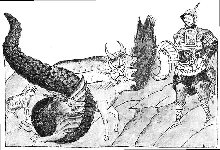 Драконы остаются в тени человеческих поступков и в важном для русской культуры XVIII в. переводном тексте античного происхождения – «Мифологической библиотеке» Псевдо-Аполлодора, который был переведен, дополнен разнообразными комментариями и издан в 1725 г. В этом обширном собрании античных сюжетов о богах, Геракле, Персее, аргонавтах и других героях неоднократно рассказывается, как наказанные богами цари «предложили» (то есть отдали) своих дочерей на съедение чудовищу, однако ни битвы, ни облик чудовищ совершенно не интересуют ни автора, ни переводчика. Сообщается лишь о намерении принести жертву, а затем – о последствиях спасения девы Гераклом или Персеем. Все эти однотипные монстры переведены как киты. Кит, угрожающий Гессионе, даже ничтожен по сравнению с грозным соперником Георгия Победоносца. Он представляется как некий крокодил, «занесенный» половодьем, который, правда, гоняется за прохожими с известной целью.