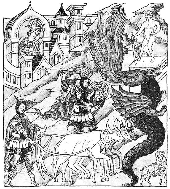 …Язон скоро и смело приходит ко змию. Его же егда же змей к себе приходяща возре, многим свистанием и велиим гласом и грозным поражая воздух, шум створити и испущая дымные пламени, ближней воздух теплым разжиганием и очервлением красит.