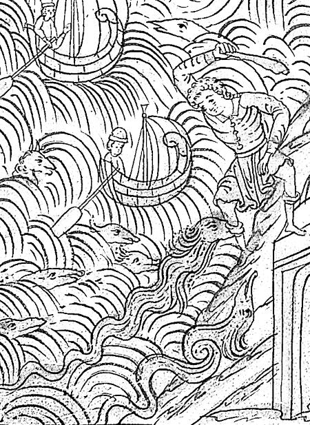 В XVII в. еще один похожий античный сюжет приходит на Русь в составе «Сказания о золотом руне волшебного овна» (это перевод из «Хроники» Мартина Бельского, польского текста XVI в.). Там воевода Ясона Геракл (называемый, как это бывает с еще не очень известными иностранными именами, то Еркулес, то Аркулес) случайно видит, как Гесиону, дочь царя Лаомедонта, приносят в жертву морскому дракону. Узнав от девицы ее печальную историю, герой без лишних слов убивает змея. Сцена поединка не описывается – для автора важнее роль, которую сыграло это событие в развязывании военного конфликта с Троей. На миниатюре конца XVII в. с иллюстрациями к этой истории море буквально кишит таинственными животными. Сразу два морских змея нападают на Геракла и едва ли смогут избежать его дубины, однако сама битва не является центром композиции, да и змеи, несмотря на оригинальные прически, не слишком презентабельны.