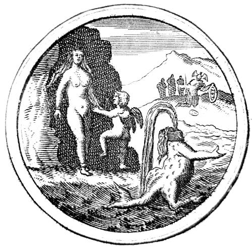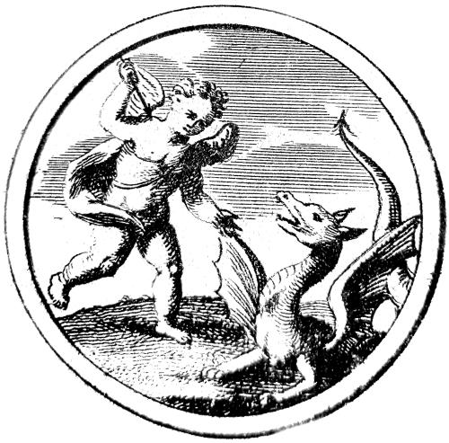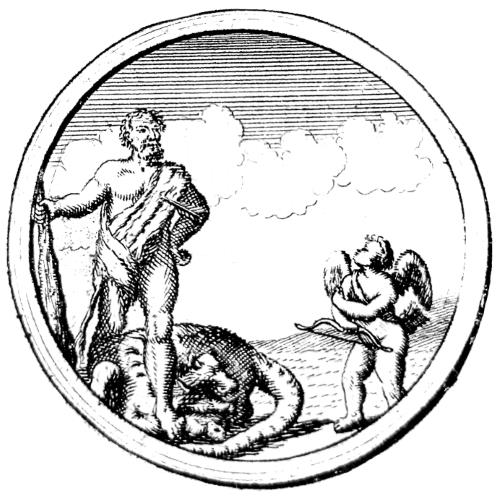 В Петровскую эпоху у драконов и змеевидных монстров появляется новый соперник – толстый крылатый мальчишка по имени Амур. Поединок змея и «божка любви» изображался на эмблемах, изразцах, в наивных бытовых росписях. Неказистый с виду змееборец все-таки выходит из схватки победителем: так иллюстрируется торжество любви над ненавистью, завистью, злобой, принявшей вид змея (иногда многоголового). Грозная сила уступает нежному чувству: этот модный парадокс появляется на эмблемах, где Геракл сидит за прялкой или где змееборец Аполлон сам оказывается под прицелом Амура (в первом издании девиз изобретательно переведен на русский: «Древле богов победитель любовь»).