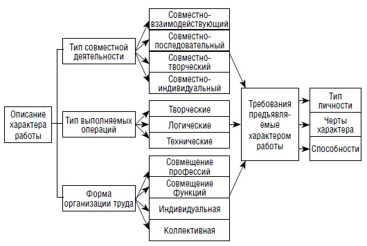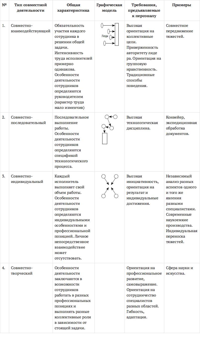 Тип совместной деятельности – это способ взаимодействия сотрудников в процессе трудовой деятельности. Различают совместно-взаимодействующий, совместно-последовательный, совместно-индивидуальный и совместно-творческий способы взаимодействия сотрудников при выполнении работы. В зависимости от преимущественного типа совместной деятельности в процессе выполнения работы к кандидатам предъявляются разные требования (табл. 1).