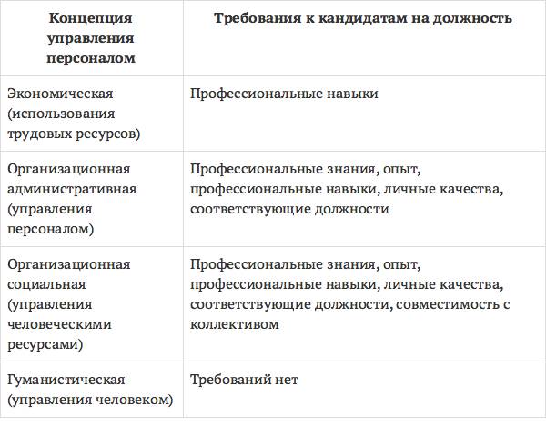 Концепция управления персоналом определяет место и роль человека в общей системе управления и влияет на требования, предъявляемые к кандидатам на должности (табл. 2).