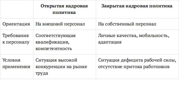 Тип кадровой политики. При подборе персонала, в зависимости от степени открытости организации по отношению к внешней среде, различают открытую и закрытую кадровую политику (табл. 3).