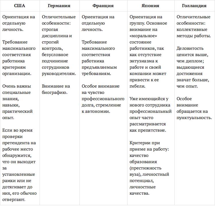 Национальные особенности. Требования к кандидатам на вакантную должность во многом определяются национальными традициями (табл. 4).