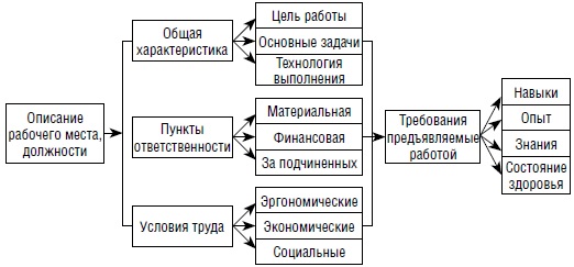 Как видно на рис. 7, описание рабочего места (должности) предполагает анализ основных должностных обязанностей сотрудника, технологии выполнения работы, эргономических, экономических и социальных условий труда. В результате анализа должности (рабочего места) могут быть сформулированы требования к профессиональным знаниям, навыкам, опыту кандидата.