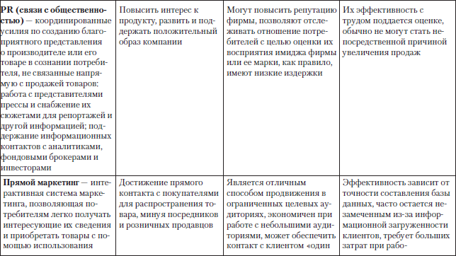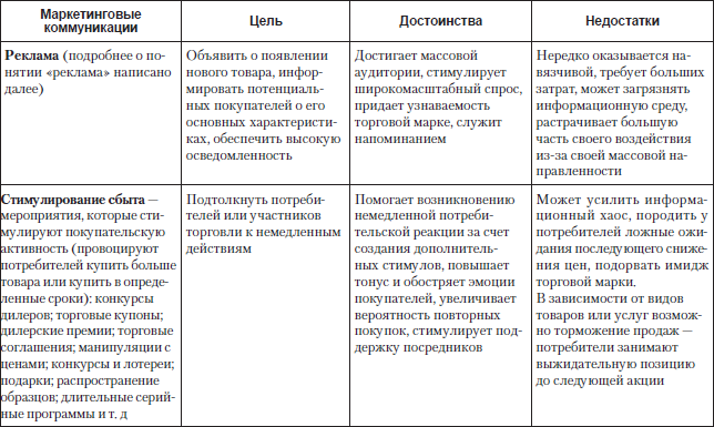Разберем подробно основные виды маркетинговых коммуникаций с точки зрения целей, которые они реализуют, а также их достоинств и недостатков. Ведь все они влияют в конечном итоге на эффективность маркетинга. Итак, к основным маркетинговым коммуникациям относятся: реклама, PR {public relations — связи с общественностью), стимулирование сбыта, прямой маркетинг, личные продажи, коммуникации в местах продаж.