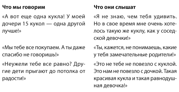 Обращая внимание на подарки, мы смещаем акценты: объектом внимания становится не ребенок, а кукла. Исполняются не детские желания, а родительские. Априори предполагается, что родитель лучше знает, что нужно ребенку, а ребенок, если он, конечно, хороший, правильный, благодарный, будет в ответ любить и слушаться родителей. Только на таких условиях родители готовы баловать ребенка.