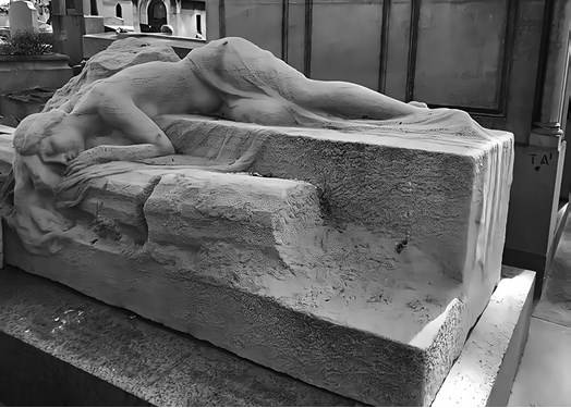 * * *Самая распространенная женская скульптура на Пер-Лашез – плакальщица. На надгробии Шопена сидит склоненная, горюющая муза музыки со сломанной лирой в руках[99]. Страждущая плакальщица полулежит лицом вниз на вертикально расположенных саркофагах семей Ленуар и Вавэн (вторая половина XIX века). Есть и более оригинальное изображение на могиле того же времени: на кладбищенской плите лежит лицом вниз полуголая экстатическая плакальщица – под ней руины столба, наводящие на мысль о смерти (ил. 21).