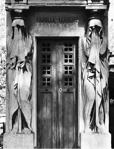 Плакальщицы, закрывающие лицо руками и установленные на мавзолеях, иногда исполняют функцию кариатид (ил. 23 и 24). Первая пара – у скульпторов XIX века Ж.-П. Дантана (с. 1869) и его брата (с. 1878)[102]. Они стоят под ионическими капителями, которые отсылают к греческим колоннам в виде кариатид, например, в Акрополе. У входа в более поздний (1891) мавзолей семьи Лериш стоят такие же плакальщицы, но выполненные в стиле модерн[103]. Из необычного: и те и другие представляют собой не только эмоциональную, но и физическую (архитектурную) опору. Плакальщицы-кариатиды встречаются и на других парижских кладбищах[104].