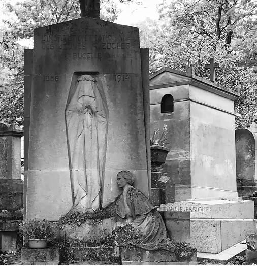 Необычный женский памятник с названием «Каменная завеса» (ил. 25) стоит на могиле Мари Бюселл (с. 1914). Символизирующий слепоту, он был установлен Институтом для молодых слепых в благодарность за ее покровительство (больше ничего об этой женщине мне узнать не удалось). Как и в случае с мадам Распай, памятник изображает задрапированную женщину, только не плакальщицу, а заступницу; на ее голове венок, в руках с переплетенными пальцами – четки. Коленопреклоненная женщина внизу возлагает ей цветы. Световые пятна на памятнике усиливают эффект складок на драпировке.