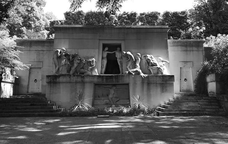 * * *Памятник «Умершим» («Aux Morts», 1895–1899) Альбера Бартоломе посвящен всем отправляющимся в мир иной; он замыкает главную аллею Пер-Лашез, которая поднимается вверх по холму Сен-Луи (ил. 26). Верхняя часть мавзолея изображает переход из этой жизни – в иную. По обеим сторонам от входа стоят голые и полуголые женщины и мужчины, испытывая страх перед потусторонним миром и протестуя против него; одна пара как раз проникла внутрь. На нижнем ярусе – женщина в роли Духа жизни, простирающая руки над лежащей умершей парой и ребенком. Недалеко от памятника похоронен сам Бартоломе; на его могиле установлена эффигия.