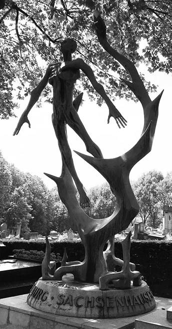 Целая аллея мемориальных скульптур посвящена жертвам Холокоста. В основном это макабрические memento mori: скелеты, погибающие или погибшие люди (ил. 31). Над кладбищем возвышается памятник жертвам лагеря Заксенхаузен в Ораниенбурге (установлен в 1970 году), изваянный скульптором Жан-Батистом Ледуком (Ledoucq) и напоминающий Альберто Джакометти. Жорж Халбут (Halbout) создал памятник жертвам лагеря Нацвейлер-Штрутгоф; геноцид олицетворяет лежащий бронзовый скелет с устрашающим и одновременно измученным оскалом черепа.