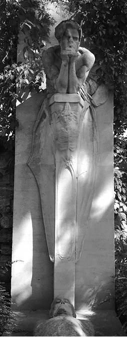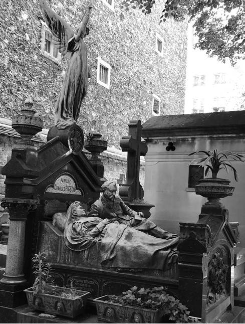 Недалеко от «Ротонды» расположено кладбище Монпарнас; оно было открыто за чертой Парижа на склоне холма Парнас в 1824 году и сначала называлось Южным. Начнем нашу прогулку по нему с двух незаурядных надгробий, установленных в начале ХX века. Первое (ил. 1) принадлежит семье предпринимателя и изобретателя безопасной керосиновой лампы Шарля Пижона и воплощает собой богатство и буржуазность: в резной двуспальной кровати лежат муж и жена (правда, аккуратно одетый муж полулежит, держа в одной руке записную книжку, в другой перо); на изголовье стоит ангел с керосиновым факелом. Умер Пижон в 1915 году, а надгробный памятник в повседневном жанровом стиле заказал еще в 1905‐м, так что он ожидал его в течение десяти лет; жену похоронили под ним в 1909‐м.