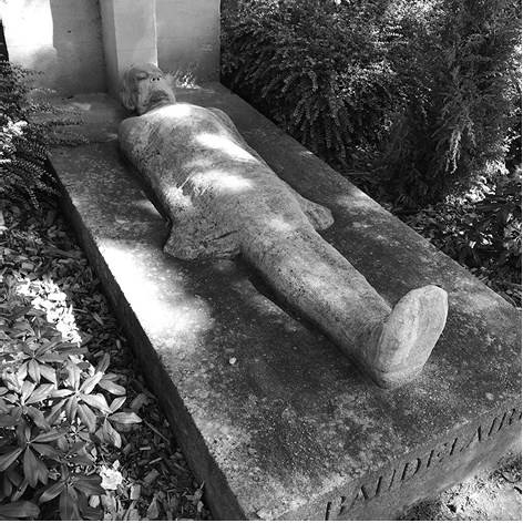 Самый необычный и редко встречающийся надгробный жанр на парижских кладбищах – реалистическая эффигия, которая появилась во второй половине XIX века. Как я уже писала, отличие нового жанра состояло также и в том, что он нарушил основной принцип архитектурной геометрии кладбища, его вертикалей и горизонталей, символизирующих жизнь и смерть. Если Жерико, как и другие подобные скульптуры умерших, полулежит на гробе, то распростертая фигура французского журналиста Виктора Нуара (с. 1870), в сюртуке и в натуральный рост, лежит плашмя на горизонтальной плите, рядом с ним – упавшая с головы шляпа (ил. 14). То есть он изображен на месте смерти. Новые эффигии, в отличие от старых, изображают лежащее тело, а не стоящее – пусть и в «горизонтальном» положении, как тела Элоизы и Абеляра. Бронзовая фигура Нуара был изваяна известным скульптором Жюлем Далу, работавшим в натуралистической манере.