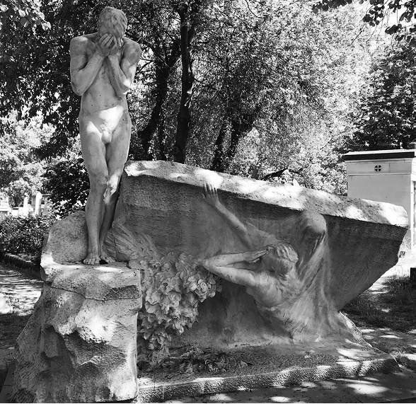 Еще один необычный памятник под названием «Разлучение пары» (ил. 7) изваял Алис Марке (Alix Marquet) в 1902 году: страждущий мужчина переживает смерть горячо любимой жены; та стремится к мужу, но Смерть тянет ее в подземелье. У памятника интересная история: изначально он находился в Люксембургском саду, но в 1965 году его перенесли на Монпарнас: городские власти сочли непристойной фигуру обнаженного мужчины. Это в шестидесятые годы! Сцена с женщиной и Смертью, тянущей ее в небытие, напоминает о памятнике Луизе Даррак на кладбище Пер-Лашез (см. с. 57–58), только там дочь вступает в поединок со Смертью, которая уводит мать в царство мертвых.