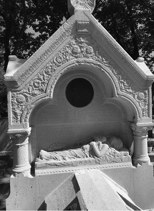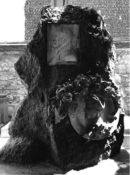 В фамильной усыпальнице Оскара Роти (с. 1911), известного художника медалей и монет, лежит классическая женская эффигия: покрытая саваном, с прижатым к груди младенцем[133] (ил. 13). Она лежит в декоративном склепе под треугольной кровлей, с полукруглыми арками и колоннами, которые его отчасти поддерживают. На гробнице с разных сторон расположены медали-портреты захороненных в ней членов семьи Роти, в том числе медаль с изображением его жены Мари (урожд. Буланже) (ил. 14).