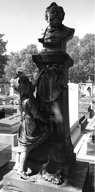 * * *Как и на других парижских кладбищах, здесь похоронено много представителей искусства. Из старых скульпторов это знаменитый Франсуа Рюд (с. 1855), автор эффигии Г. Кавеньяку на Монмартре (см. с. 89); на могиле Рюда стоит портретный бюст на постаменте с лавровым венком (ил. 15), как и внизу на горизонтальной плите – от его учеников (здесь он не виден). На кладбище Монпарнас лежит и Жюль Далу (с. 1902), изваявший эффигии В. Нуара и Л.‐О. Бланки на Пер-Лашез (см. с. 52). Из писателей эпохи fin de siècle – Ги де Мопассан (1893) и Ж.-К. Гюисманс (1907), автор декадентского романа «Наоборот» (герой которого дез Эссент находится на пороге смерти, см. с. 18). На могиле пейзажиста Густава Юндта (с. 1884), как и у Рюда, стоит портретный бюст на высоком постаменте работы Огюста Бартольди, на котором девочка укрепляет палитру с кистями (ил. 16).