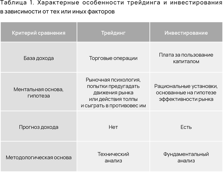 В таблице 1 в наглядной форме показаны различия между трейдингом и инвестированием.