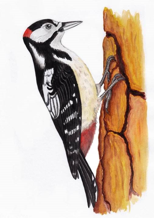 И правда, издали Нюся заметила, как летит большая птица, пёстрыми крыльями машет, красные пёрышки у неё на голове блестят. Сел дятел на ствол сосны, крепко когтями за кору уцепился, упёрся хвостом – и давай клювом стучать!