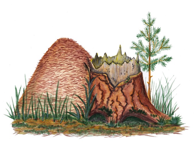 – Когда старое дерево падает, муравьи поселяются внутри пня, – объяснил Зяблик. – Та куча хвоинок, что мы видим – это лишь самый верх муравейника. На корнях пня, уходящих глубоко в землю, муравьи строят огромный дом. Самые главные помещения муравейника никто не видит: под корнями пня муравьи прячут камеры для хранения запасов, для выращивания личинок и, конечно же, для муравьиной королевы, которую охраняют.