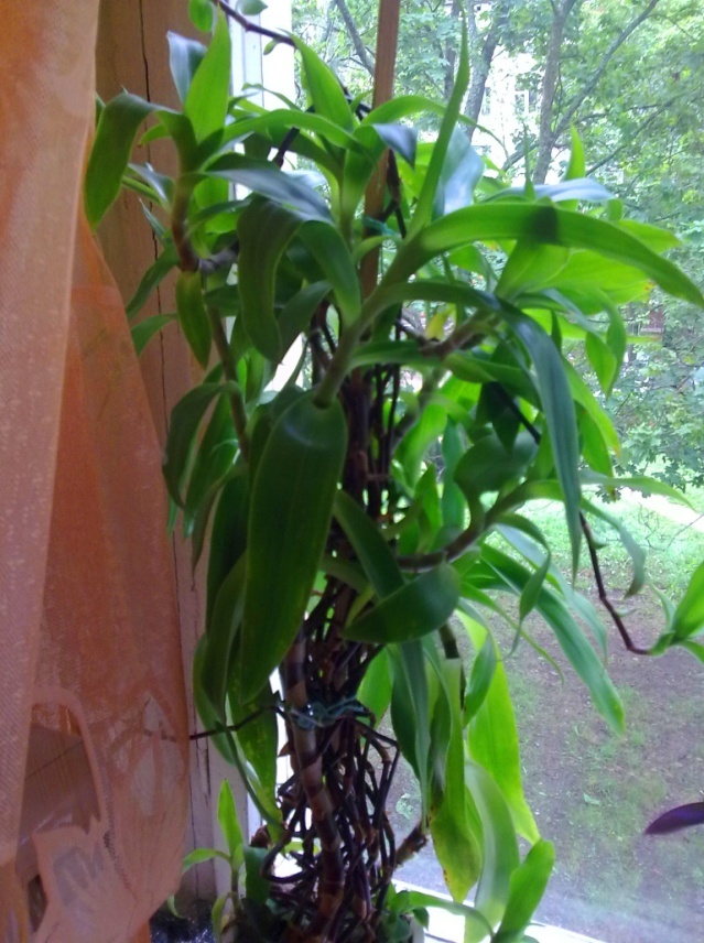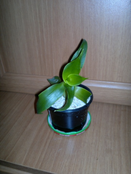 Семейство Коммелиновые. Травянистое зеленое стелющееся растение. Листья линейные ремневидные длинные, сужающиеся к концу. Листорасположение очередное, основание листа «обнимает» стебель. Растение можно выращивать как почвопокровное в горшках с большим растением. Можно выращивать как солитер, направляя побеги на опору (как на картинке), можно как ампельное в подвесной корзинке. Можно попробовать придать кализии форму куста, постоянно подрезая верхушку стебля. Также каждый год можно выращивать новое растение. На фото изображен вид кализии ползучей. Имеются и другие виды. Кализия растение неприхотливое. Подходит для начинающих цветоводов. Вы можете забыть её опрыскать или удобрить, она от этого не пострадает. Но полив обязателен. На фото кализии 2 года. Высота растения 1 метр. Со временем нижние листья у кализии высыхают, на их месте образуются междоузлия с зачатками корешков.