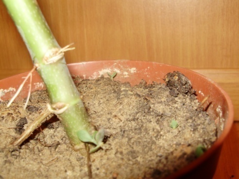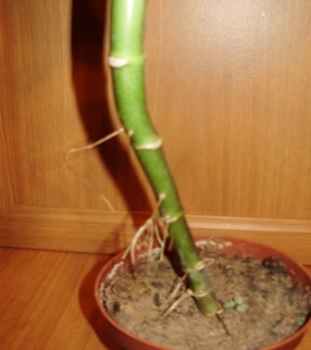 Часть стебля нарезаем стебель на черенки, чтоб на каждом было по одному рубцу. Присыпаем места срезов углем и кладем на влажную землю. Следим, чтоб черенки не загнили. Почва не должна быть сильно влажной и сухой.