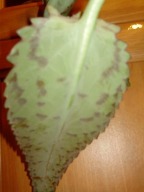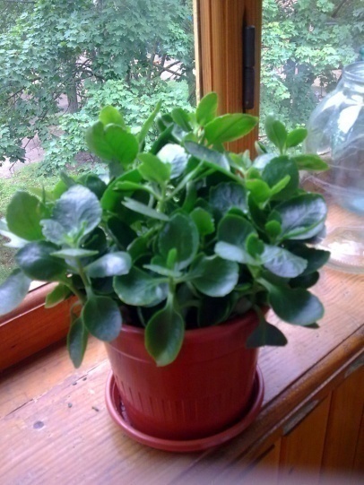 На фото куст из множества укорененных черенков. На самом деле у него довольно крупные листья. Отличительной особенностью его от двух предыдущих видов является цветение. Соцветие напоминает зонтик. Цветки бывают красные, розовые, синие, оранжевые, желтые, зеленые. Цветки не пахнут. Для того чтобы этот каланхоэ зацвел ему требуется 8-ми часовой солнечный день. Это растение короткого дня. При более длительном освещении он не зацветет, а будет наращивать зеленую массу.
