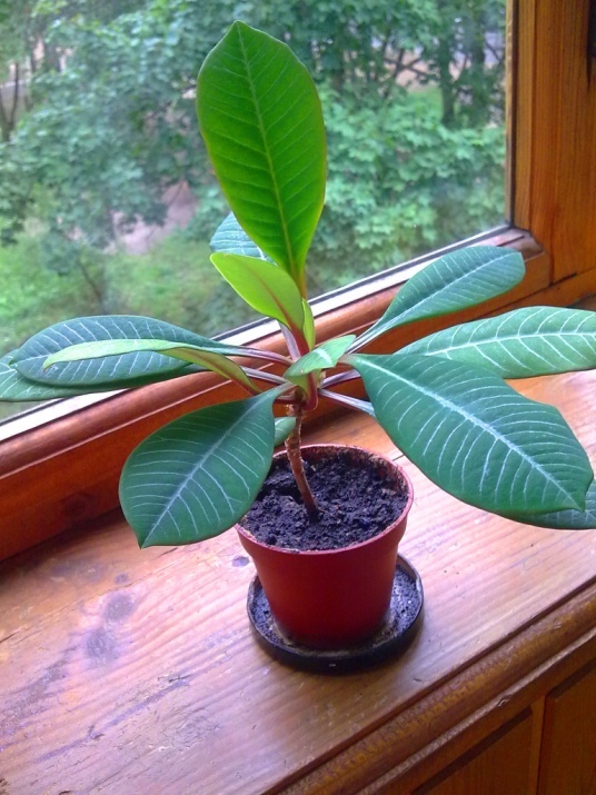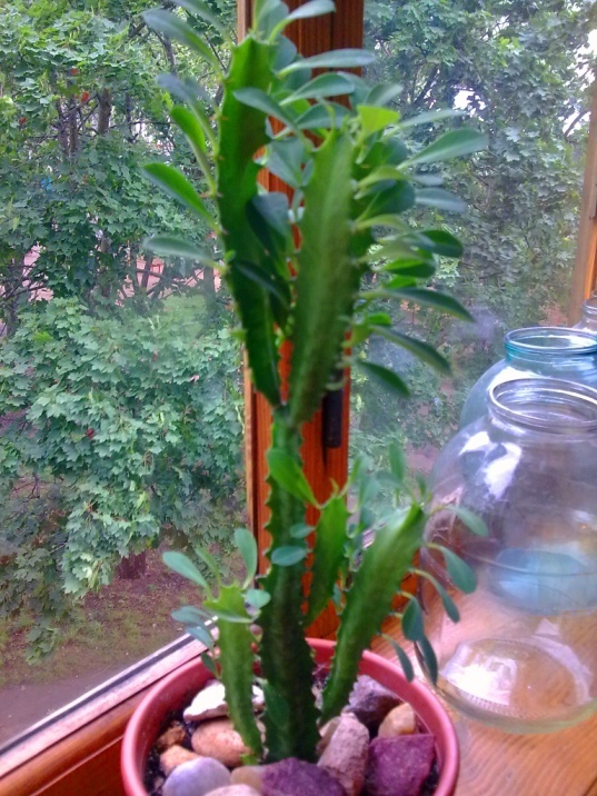Трудно поверить, что эти два растения принадлежат к одному роду. Тем не менее, это так. Здесь представлены только два вида: верхний это молочай тирукалли, а рядом – молочай ребристый. На самом деле есть очень много видов молочаев, около 2000, и все они настолько не похожи друг на друга. Все молочаи очень ядовиты. У них млечный сок, который может вызвать раздражение, поэтому с молочаями нужно работать в перчатках.