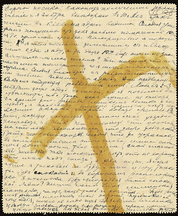 «Дорогой Пусика! Наконец получилось разрешение и я завтра выезжаю в 10 ч. веч. Итак пиши в Киев на адрес Вадима…» Письмо Нади Фишман Петру Добычину с отметкой тюремной цензуры. 1903