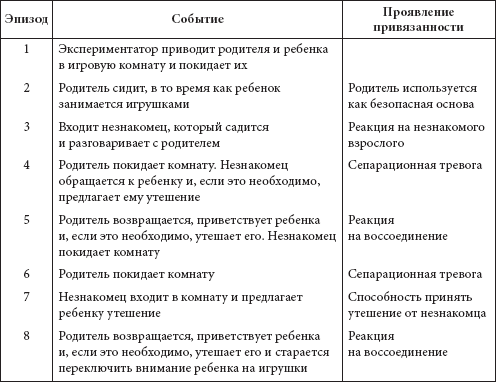 По мнению Боулби, именно качество устанавливаемых отношений с матерью или лицом, ее заменяющим, имеет ключевое значение для формирующегося у ребенка качества привязанности. М. Эйнсворт, последовательница и коллега Д. Боулби, предложила стандартную процедуру измерения качества привязанности между матерью и младенцем. Это методика «Незнакомая ситуация», которая составляет последовательность из восьми эпизодов (см. табл. 2.1) [Берк, 2006, с. 665].