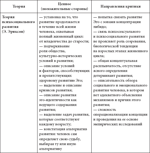 Итак, с точки зрения Э. Эриксона, последовательность стадий является результатом биологического созревания. Содержание развития человека определяется тем, что ожидает общество, к которому он принадлежит, какие задачи оно ставит; индивидуальное своеобразие развития зависит от того, как ребенок, а впоследствии и взрослый человек решает эти задачи, справляется с социальными вызовами общества. Успех на предыдущих стадиях влияет на возможность успеха на последующих, но не предопределяет его. В то же время неудачи на одной стадии развития не обязательно обрекают человека на неуспех в следующем периоде жизни.