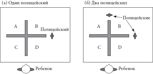 3. Критика Ж. Пиаже со стороны М. Дональдсон [Баттерворт, Харрис, 2000, с. 217–220]. Основной тезис М. Дональдсон состоит в том, что дошкольники гораздо более компетентны, чем это допускает Ж. Пиаже. Она считает, что тестовые задачи Ж. Пиаже слишком абстрактны и не связаны с повседневным социальным опытом ребенка, из-за чего он недооценивает возможности дошкольников. Она обсуждает эксперимент М. Хьюза на детский эгоцентризм, где ребенок получает задание «спрятать» куклу-мальчика от одного или двух кукол-полицейских. Задание изображено на рис. 2.5.