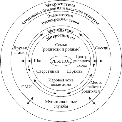 Макросистема – внешний уровень в модели У. Бронфенбреннера – не имеет отношения к окружению, а включает в себя культурные ценности, законы, обычаи, традиции, ресурсы. Значение, которое макросистема придает потребностям детей, влияет на поддержку, которую они получают на внутренних уровнях экологических систем. Например, принятые в стране стандарты качества помощи детям, законы в сфере образования, определенные педагогические эксперименты, программы развития сети дошкольных учреждений, организация летнего отдыха детей, обучение детей с задержками развития в обычных школах и т. д. – все это может воздействовать на другие уровни экосистемы и, следовательно, оказывать влияние на развитие ребенка.