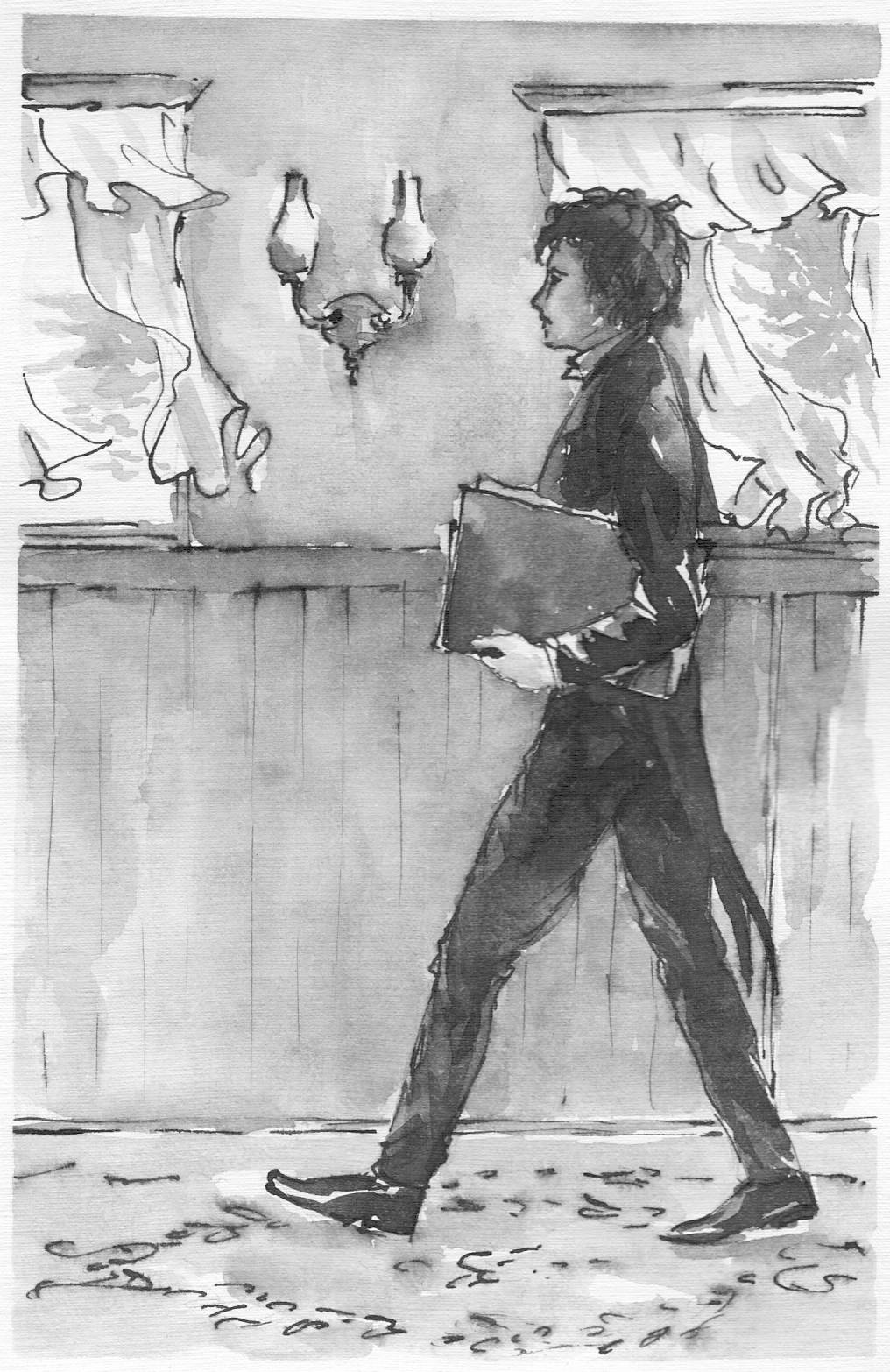 With a black folder tucked under his arm, a young man in a thin coat was walking through the carriage of the Imperial Train. Suddenly, he caught the toe of his boot on a stray carpet runner and, before he knew it, ended up on the floor. The papers came fluttering out of his holder like a bird taking wing. The train, going at full speed, turned a corner and caught the wind through the windows, sending the papers flying even further. Dismayed, the young chap began to dart around the carriage in a hurried attempt to catch them all and stuff them back into his folder.