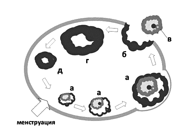 Рисунок 1. Строение яичника: а – созревание фолликула (ооцита); б – овуляция; в – яйцеклетка; г – расцвет желтого тела; д – регресс желтого тела.