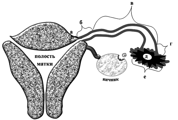 Рисунок 2. Расположение и строение яйцевода: а – маточная часть трубы; б – перешеек; в – ампула; г – воронка; д – входное отверстие для прохождения яйцеклетки; е – бахромки.