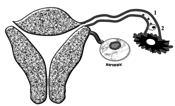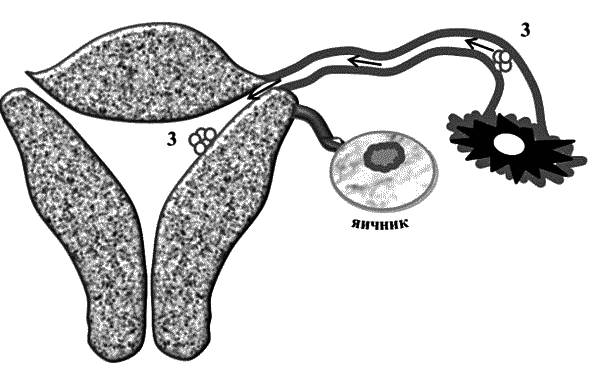 После овуляции бахромки фаллопиевой трубы приближаются к яичнику, совершая захватывающие движения, улавливают яйцеклетку и направляют ее в маточную трубу (рис. 3, а, б). Реснички внутренней выстилки маточной трубы смещают ее в сторону матки. После овуляции яйцеклетка живет около 3 суток. При этом она находится в трубе, где также может быть оплодотворена сперматозоидом (рис. 3, в).
