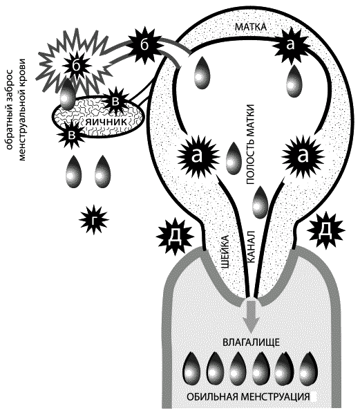 Распространению эндометриоза способствует обратный заброс менструальной крови, содержащей частички слизистой оболочки матки (эндометрия), через маточные трубы в малый таз и брюшную полость (рис. 1, б—д).