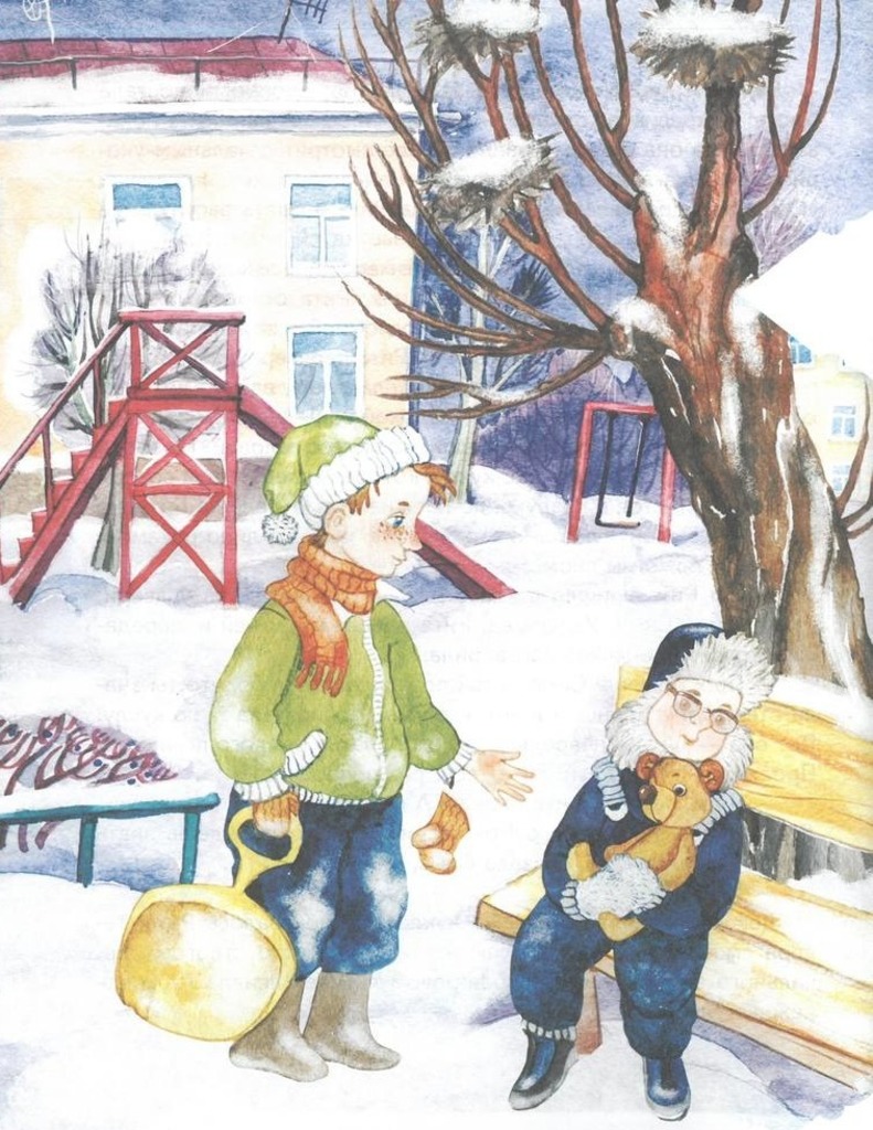 Когда солнечным рождественским утром Алёша вышел во двор, на детской площадке, на кончике обледенелой скамейки сидел маленький мальчик, прижав к груди плюшевого медвежонка. Малыш был в тёмно-синем тёплом комбинезоне, в курточке с меховым воротничком, в меховой шапочке, а на глазах были надеты дымчатого цвета очки. Несмотря на мороз, он сидел, не двигаясь, только время от времени крепче прижимал к себе мишку. Алёша побросал в воздух снежки, пару раз прокатился с деревянной горки, которая стояла в центре детской площадки, думая, что мальчик тоже присоединится к игре, но малыш так и сидел, не двигаясь с места. Тогда Алёша подошёл к нему, и, чтобы как-то начать разговор спросил: