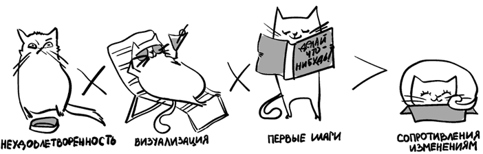 Предлагая рассказать обо всём том, что не нравится, можно услышать следующее: «Хорошо, рассказали, что нам не нравится, а дальше-то что?! Почти вся страна пребывает в разговорах, что нам всем не нравится». Можно, конечно, остаться быть недовольным, тратить свою энергию на ворчание, уныние и печаль, а можно попробовать начать движение вперёд, направив энергию на изменения в лучшую сторону. Если в жизни или бизнесе происходит не то, что хотелось бы, почему бы не воспользоваться формулой перемен, которая помогает создать изменения не только в организационных структурах, но и в личной жизни?! Её автор Ричард Бекхард, профессор Школы менеджмента им. А. Слоуна, эксперт по теории организационного развития. Когда я впервые услышала об этой формуле, меня очень обрадовало, что недовольств может быть много. Даже очень много, даже здорово, когда их совсем много, даже как-то странно, если бы их вовсе не было.