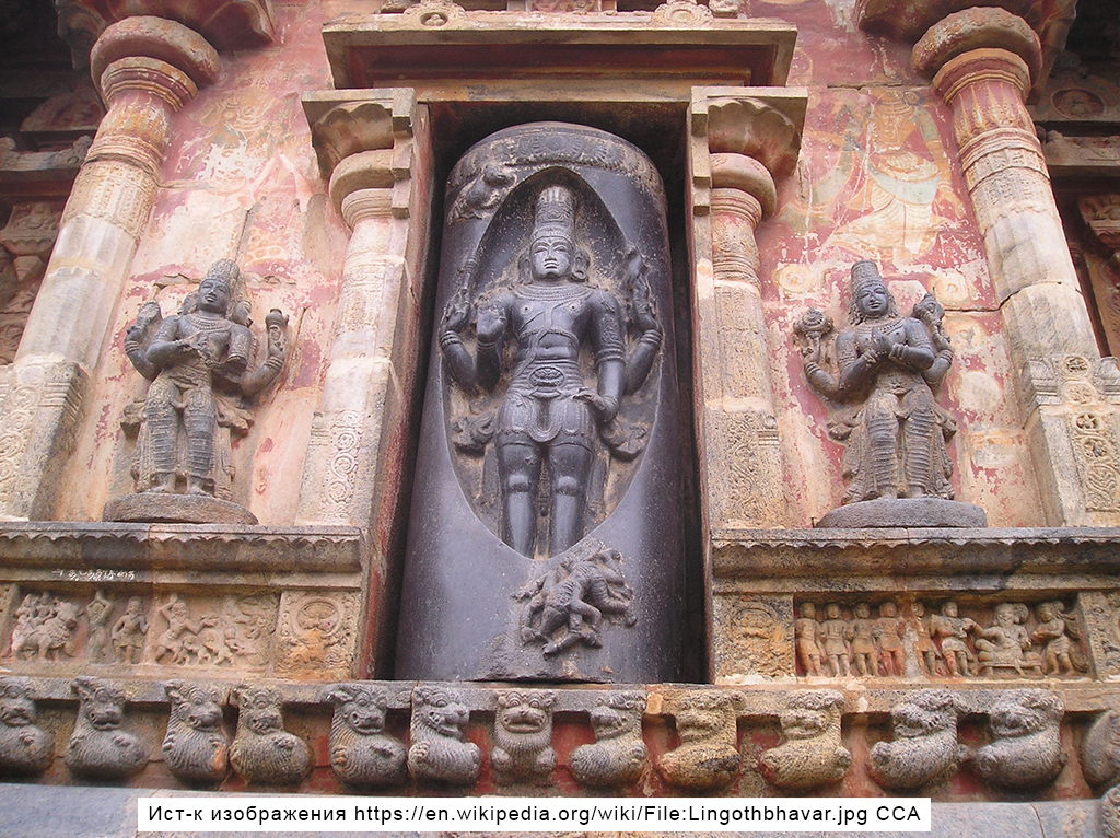Статуя Шивы, изображающая его явление из огненного безграничного лингама. По краям изображены поклоняющиеся ему Брахма и Вишну.