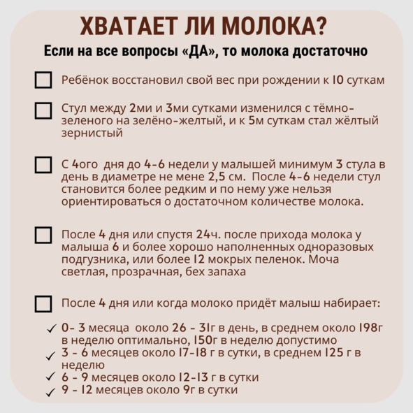Есть достоверные признаки, которые помогут вам понять хватает ли в действительности у вас молока. Сверьтесь с чек листом, если на все вопросы ответы «ДА», то ваша крошка получает достаточное количество молока.