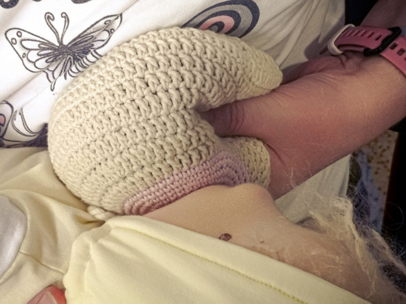 – подбородок прижат к груди, а нос не касается, есть просвет между грудью и носиком