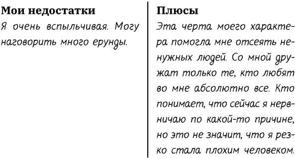 Через пару лет, если ты откроешь эту книжку и увидишь свои записи, вспомнишь ситуации, в которых твои недостатки мешали тебе наслаждаться жизнью, думаю, ты посмеешься над собственной неуверенностью в себе и порадуешься, что ты научилась поворачивать ситуации в свою пользу.