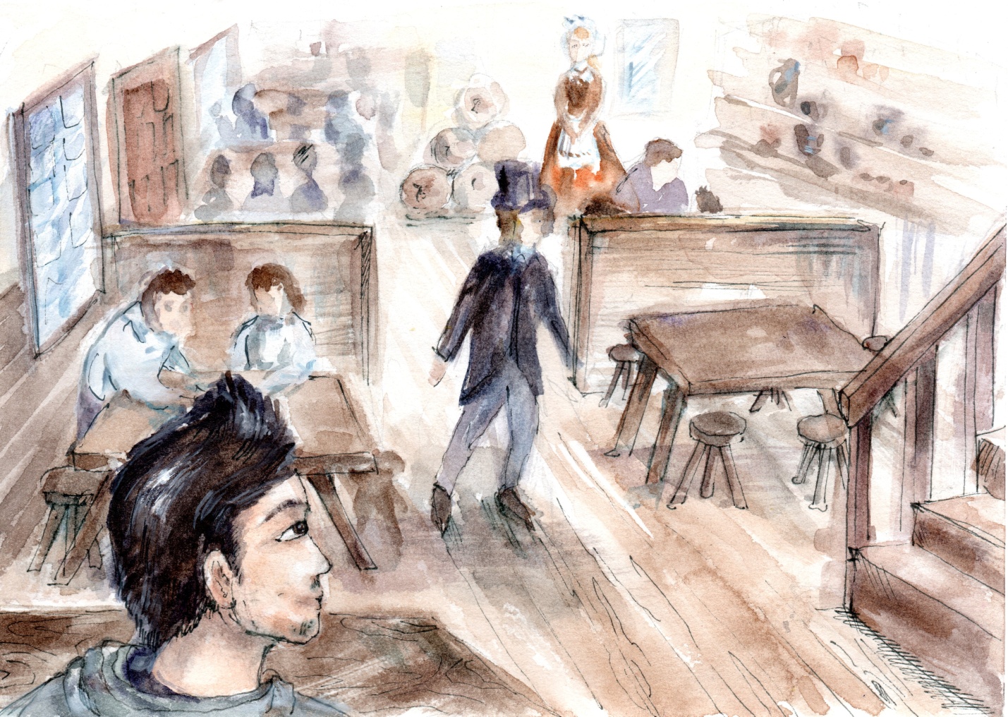 When they came to the tavern, people have already begun to approach. Young mistress asked Ivan to put on a waiter’s apron, also left over from her brother, and help to serve customers.