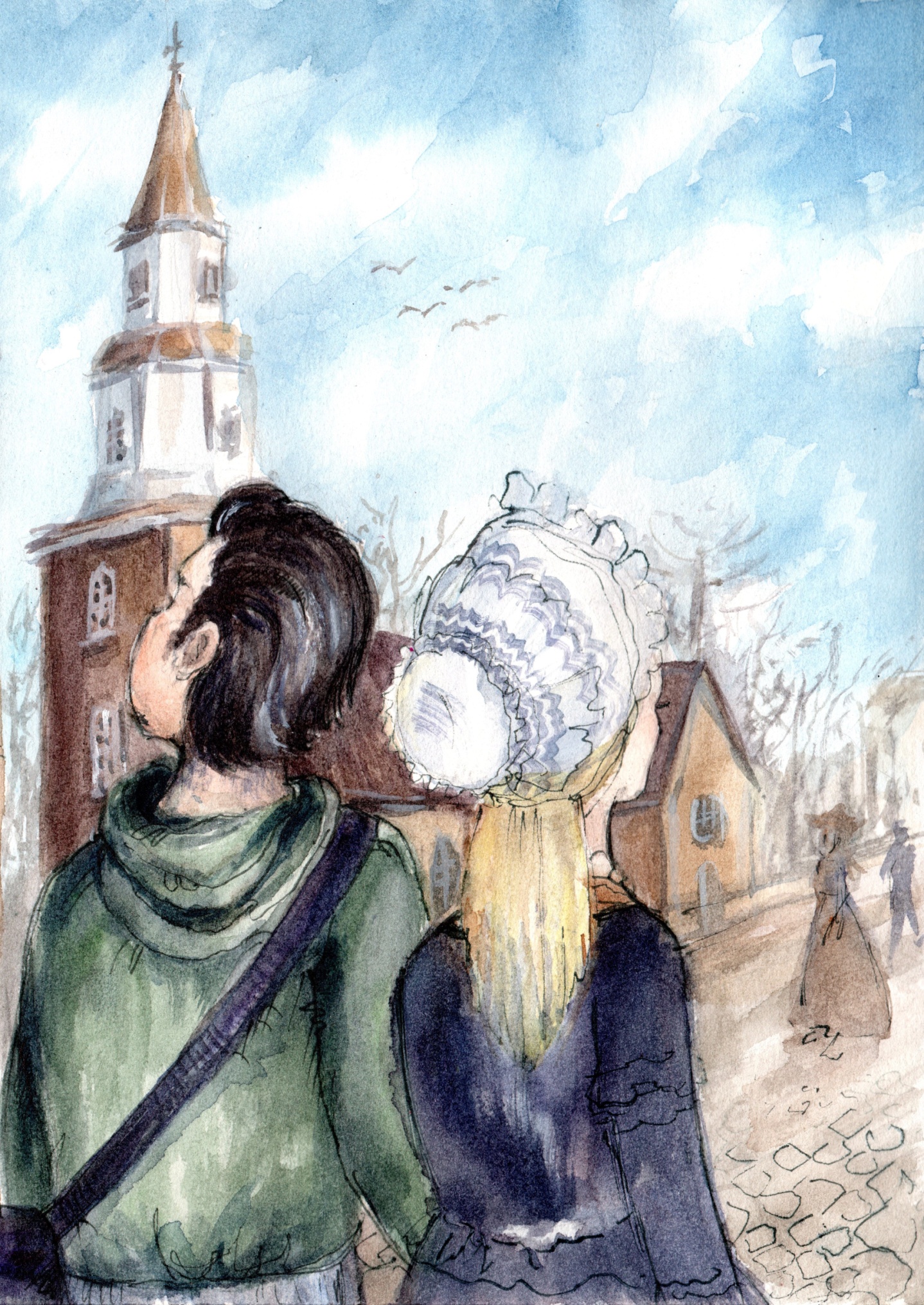 They went back following the same way, but the guest from future had time to notice something new in particular: the ancient sun clock on a square nearby the church. Looking at it, he realized that it was almost a lunch break, which means they needed to step faster: according to Mary, there must be a lot of people in the tavern at this time.