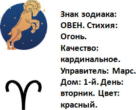 Ключевые слова к знаку зодиака Овен: девиз «я есть», «я первый», «быть первым», «вижу цель, не вижу препятствий», импульс, начало, лидер, активность, энергия, адреналин, скорость, ускорение, стимулятор, импульсивность, действие, движение вперед, решительность, мотивация, независимость, настойчивость, грубость, самостоятельность, прямолинейность, поспешность, первопроходец, инициатор, увлеченность, храбрость, достижение результата, искренность, эгоцентризм, воля, конкуренция, борьба, агрессия, гнев, злость, соревнования, спорт, бизнес, силовые структуры, охота, победа, потенция, либидо, фаллос.