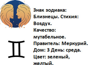 Самый легкий знак, легко ко всему относится. Знак поверхностный, глубоко не погружающийся. Знак деталей. О нем можно сказать: бес и ангел в одном лице, так как олицетворяет две разные личности, и ты никогда не будешь уверен, с какой из них столкнешься. Стихия воздуха говорит о том, что он легок в общении, коммуникабелен, без труда знакомится. Для него не важен статус. Ведет себя одинаково как с высшим чином, так и с низшим. Может на равных общаться как с президентом, так и с дворником. Он любознательный, постоянно чем-то интересуется, чему-то обучается. Постоянно любит посещать различные курсы и семинары. Хорошо может реализоваться в СМИ, маркетинге, торговле, там, где надо передать информацию, например, диктор на радио, журналист. Благодаря мутабельному качеству он может копировать и подделывать, сам ничего не создавая. Увидел бизнес, скопировал и заработал на этом денег. Изменчив, умеет подстраиваться, хорошо может реализовываться в посреднической деятельности и там, где есть перемещение, например, курьер или водитель автотранспорта.